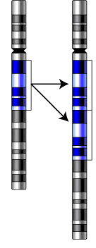 Fíjate en la ilustración de la imagen, que representa a un cromosoma en la que se señala un gen que se duplica —en azul— y señala la definición más correcta: |
