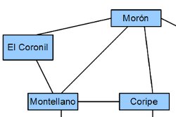 Vamos a verlo en un ejemplo. Recuerdas el mapa y el grafo que teníamos de los pueblos que rodeaban a Morón. Vamos a acortarlo un poco porque la matriz que salía era considerable. Vamos a quedarnos sólo con cuatro pueblos: Morón, El Coronil, Montellano y Coripe.