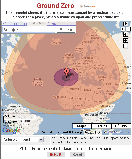 Compara la simulación que hemos realizado sobre los impactos de una bomba termonuclear como la lanzada sobre Nagasaki (Fat Man) y el impacto de un gran asteroide (ambos centrados en la ciudad de Badajoz). Puedes hacer tú mismo la simulación en la página Carloslab (el software utilizado está bajo dominio público):