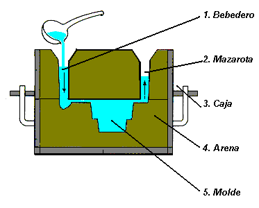 Al construir el molde hay que diseñar los conductos por los que se tiene que verter el material fundido, (bebederos) y los conductos por los que debe evacuarse el posible material sobrante (mazarotas).