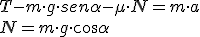 En primer lugar se escriben las ecuaciones correspondientes a cada uno de los cuerpos; para el cuerpo situado en el plano inclinado, éstas serán las generales del plano inclinado que ya se calcularon sin más que sustituir F por la tensión T, resultando: