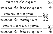 Observa que ya tienes la proporción entre masas que necesitabas. Estas masas están expresadas en unidades de masa atómica (u), pero como la ley de las proporciones constantes indica que estas proporciones deben ser siempre las mismas, tendrán que verificarse independientemente de las unidades en las que la masa se exprese. Por ello es posible afirmar que siempre que el hidrógeno y el oxígeno reaccionen para producir agua, lo harán en la siguiente proporción: