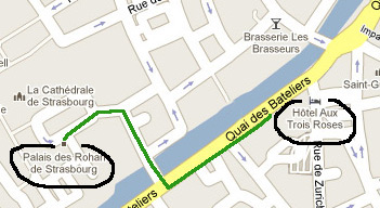 | Prenez le Quai des Bateliers jusqu'au premier pont que vous verrez. Traversez la rivière en prenant le pont. Puis, continuez tout droit. Tournez la première rue à gauche. Continuez tout droit. Tournez sur la troisième rue à droite et puis immédiatement à gauche. Suivez cette rue jusqu'à la cathédrale de Strasbourg. Là-bas entourez la cathédrale sur la gauche et vous verrez le Palais des Rohan de Strasbourg. |