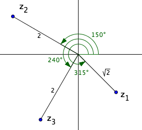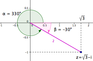 Cuando tratamos de averiguar el ángulo que corresponde a este valor de la tangente la calculadora nos devuelve como resultado –30º. Por ello es conveniente que, mediante la representación gráfica, averiguemos en qué cuadrante está el afijo de z para poder dar la respuesta adecuada, que en este caso será 330º.