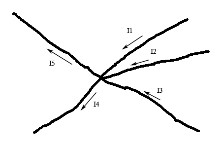 Para aplicar esta ley debemos fijar arbitrariamente un sentido positivo, por ejemplo, consideramos positivas las intensidades de entrada al nudo. De esta forma el nudo dibujado anteriormente quedaría de la siguiente forma: