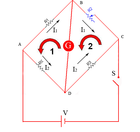 Una vez cerrado el interruptor modificaremos el valor de la resistencia variable R2 hasta conseguir que la intensidad por R1 y R2 sea la misma y que la intensidad por R3 y Rx sea también la misma (galvanómetro marcando 0).