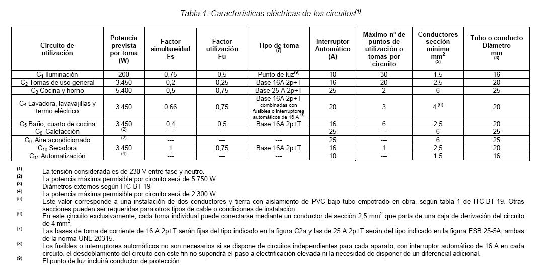 En la tabla 1 de la ITC-BT-25 del REBT, se relacionan los circuitos mínimos previstos con sus características eléctricas.