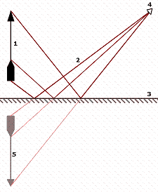 En la imagen puedes observar la formación de la imagen en un espejo plano. El objeto (1) emite rayos luminosos (2) que se reflejan en el espejo (3), de forma que el observador (4) ve una imagen de tipo virtual (5).