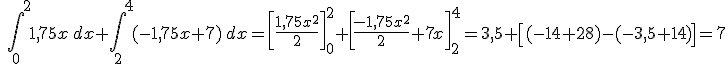 Por lo tanto, en primer lugar debemos determinar el punto de corte de las dos rectas y = 1,75x e y = -1,75x + 7. Con un simple sistema de ecuaciones, obtenemos que la solución se obtiene para x = 2. Así, integraremos la función y = 1,75x entre [0,2] y la función y = -1,75x +7 entre [2,4] (el valor extremo es 4 ya que es donde la recta y = -1,75x +7 corta al eje X)