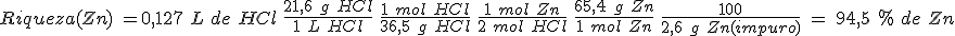 Para disolver 2,6 g de cinc impuro se han gastado 127 mL de una disolución de HCl con una composición en masa de 21,9 g/L. ¿Cuál es la riqueza (pureza) de la muestra de cinc? Las impurezas no reaccionan con el HCl(aq).