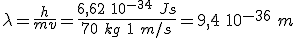 del orden del tamaño de la zona en la que se mueve el electrón del átomo de hidrógeno. Solamente tienes que sustituir en la expresión de De Broglie los valores de la masa del electrón (9,1 10-31 kg), la constante de Planck (6,62 10-34J.s) y la velocidad de la luz (3 108 m/s).