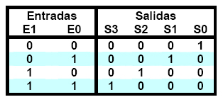 Por ejemplo un decodificador de 2 entradas y 22=4 salidas, tendría la siguiente tabla de verdad: