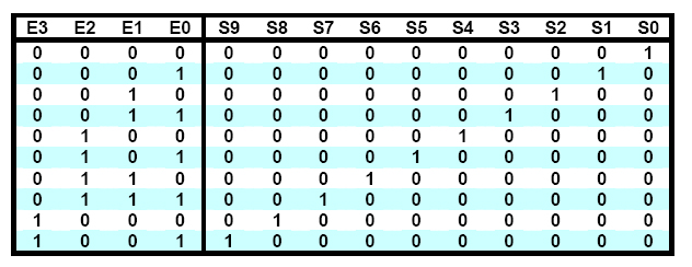 En primer lugar se debe utilizar un decodificador que tenga igual o mayor número de líneas de entrada que el número de variables de la función lógica. En nuestro ejemplo un decodificador de cuatro a diez líneas, con salidas activas a nivel bajo y conectando a masa la entrada de mayor peso