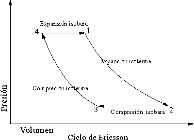En este ciclo termodinámico, también reversible y por tanto nos da el rendimiento máximo que se puede obtener de la máquina, el fluido evoluciona realizando dos transformaciones isotermas y dos isobáricas, tal como se puede observar en la figura adjunta: