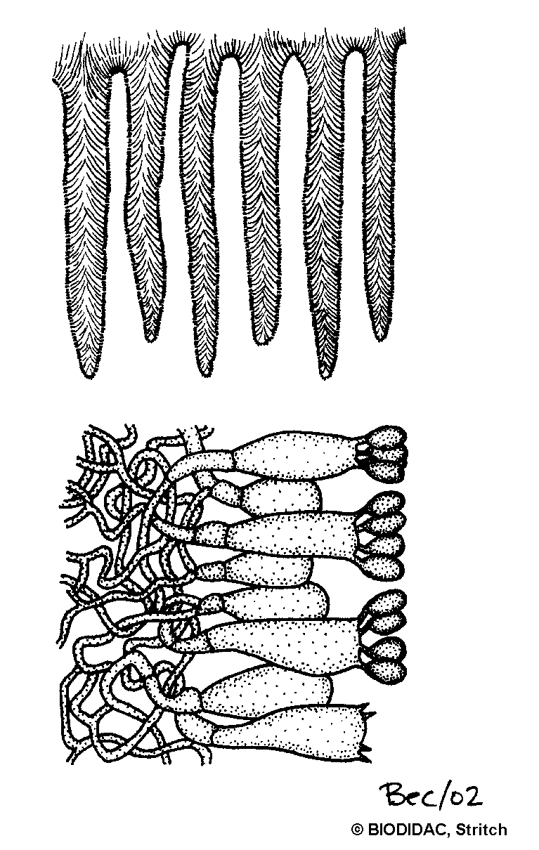 - Sombrero: estructura superior con forma similar a un paraguas. En su cara interna se encuentra el himenio (hifas que poseen los basidios).