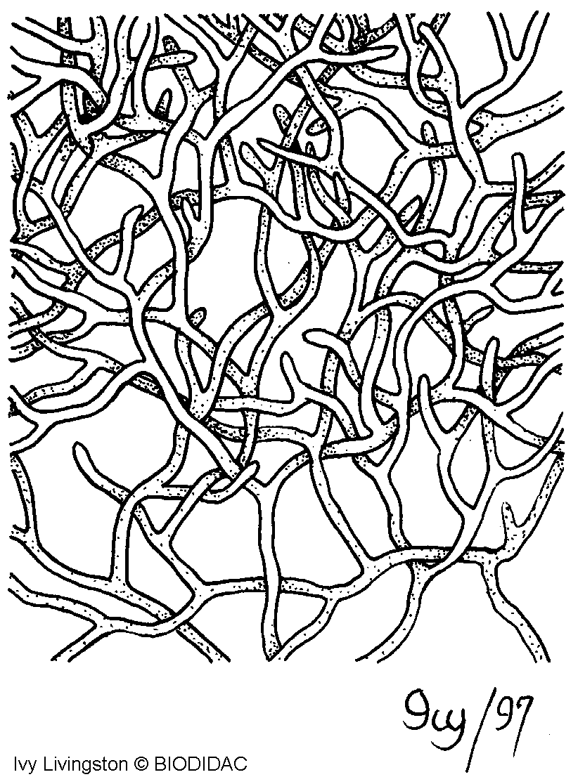 El talo de un hongo se llama micelio. En él las células se disponen formando filamentos o hifas que pueden ser simples o estar ramificadas. Las hifas pueden estar tabicadas por septos o tabiques (imagen 16) o bien carecer de estos con lo que la hifa es una enorme celula plurinucleada (imagen 17).