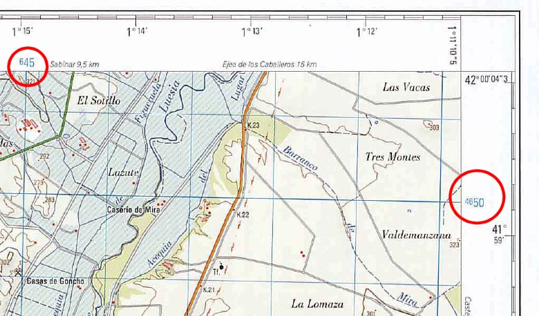 Los círculos están mostrando las coordenadas UTM del mapa topográfico. La coordenada X aparece con tres dígitos (645) en el que el primero se muestra con un menor tamaño. Ese punto indicaría un punto kilometrico a partir del cual cada cuadrado de la derecha indicaría un kilómetro más en el eje X. En cuanto a la coordenada y viene designada por 4 dígitos (4650). Ese punto indicaría un punto kilométrico a partir del cual cada cuadrado superior indicaría un kilómetro más en el eje y.